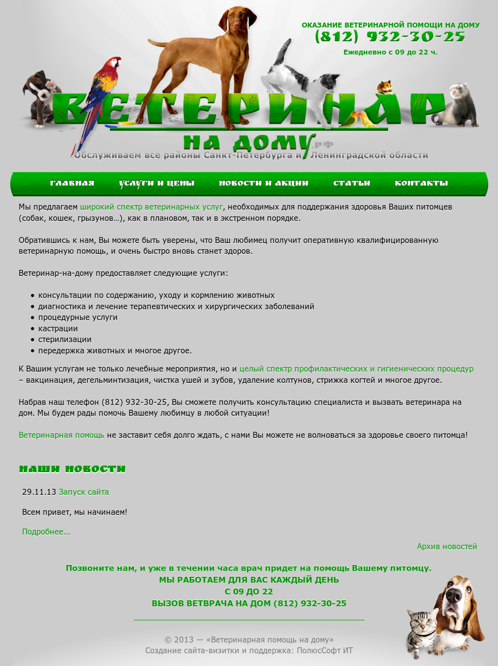 Сайт визитка для ветеринара, оказывающего помощь на дому в городе Санкт-Петербурге и Ленинградской области.