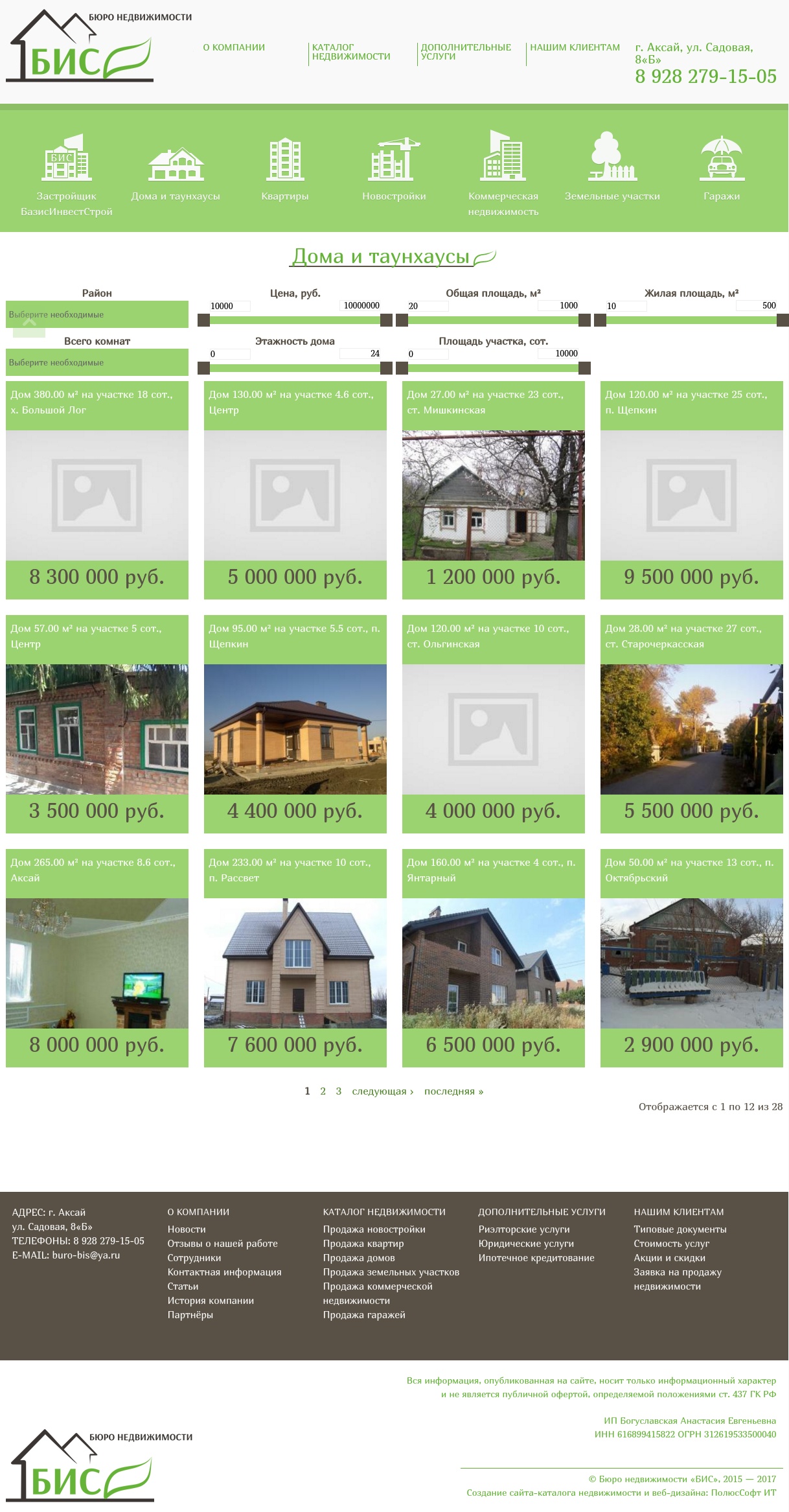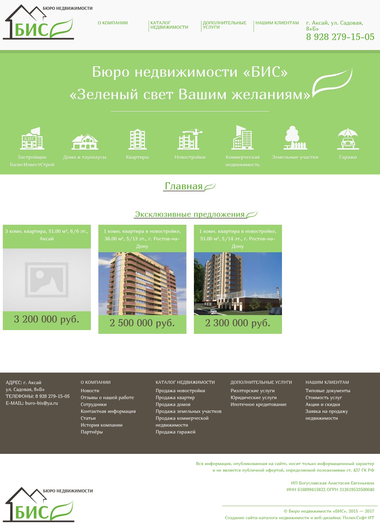 Создали корпоративный сайт-каталог агентства недвижимости «БИС» в г. Аксае. Так же разработали дизайн сайта, сверстали с добавлением небольших эффектов и анимаций. Сайт адаптирован для отображения на мобильных устройствах: смарфонах, планшетах.
