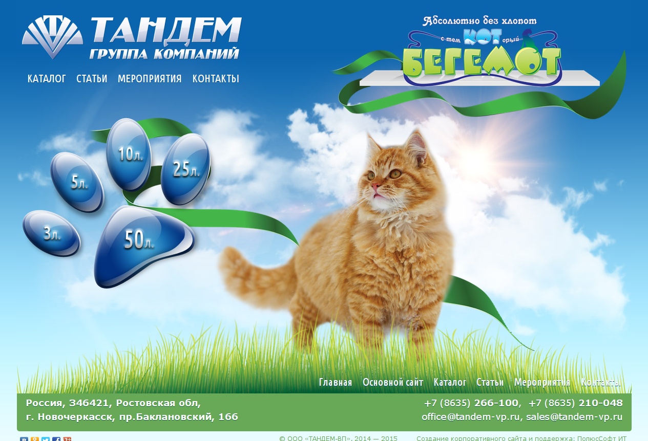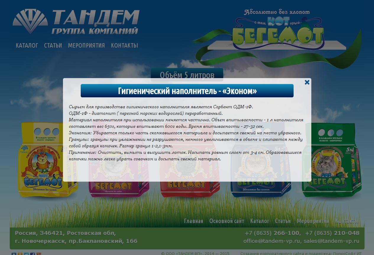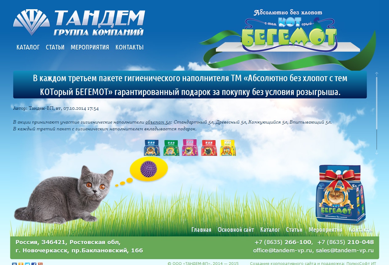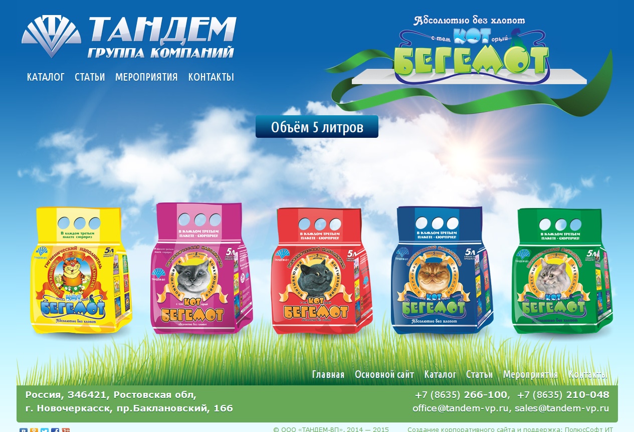 Создали корпоративный сайт с каталогом продукции для ООО «ТАНДЕМ-ВП», его подраздления по производству гигенических наполнителей. На основе предложенных макетов дизайна выполнена доработка их до состояния, готового для публикации в интернете, после чего сверстали дизайн, добавив анимации, различные эффекты, выполнив в том числе адаптивную вёрстку для мобильных платформ. Из особенностей сайта стоит отметить, что страница каталога продукции сделана в нетипичном стиле.