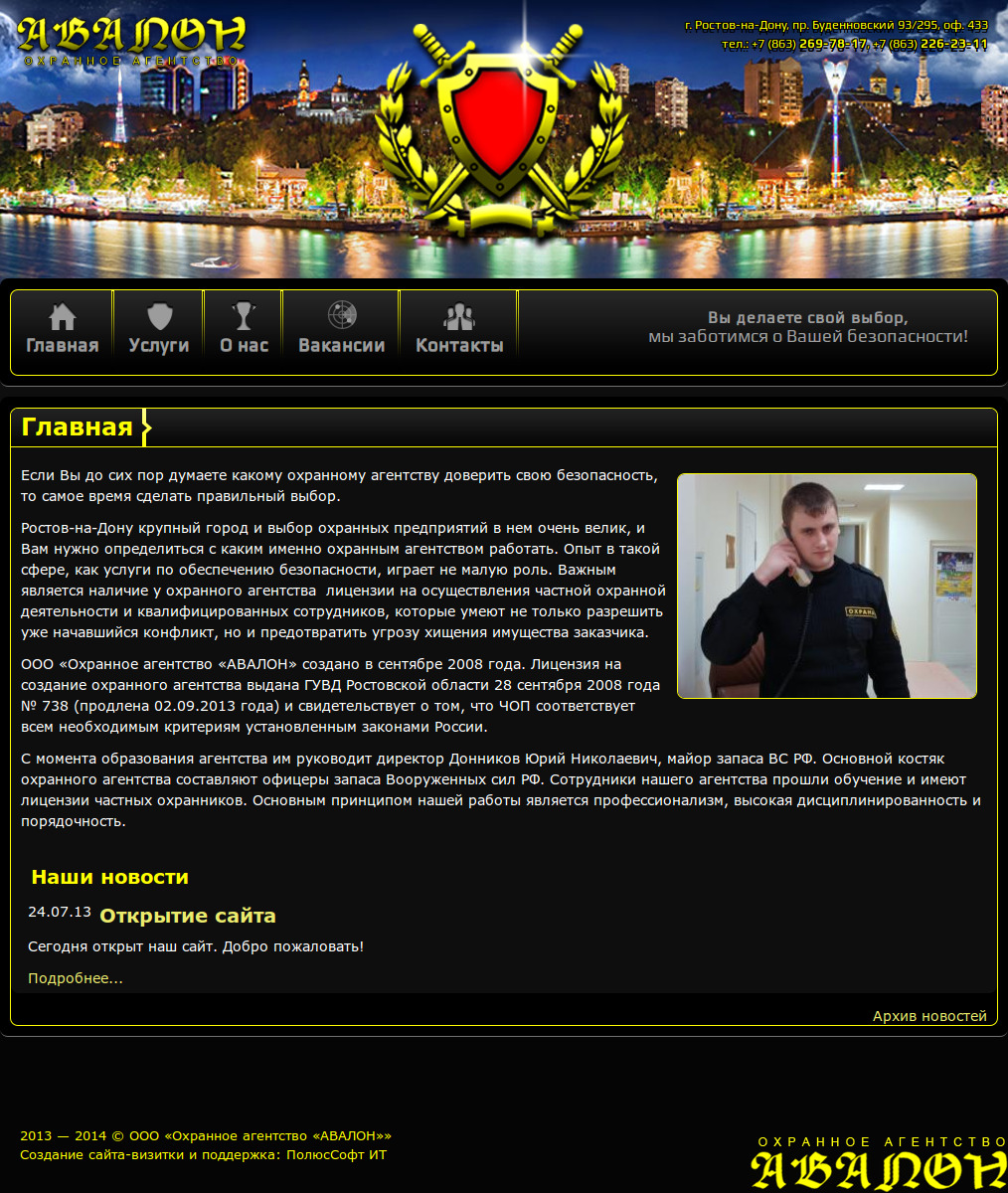 Разработан сайт-визитка и дизайн сайта для Охранного агентства «АВАЛОН». Так же были разработаны макеты бланка для письма и факса.