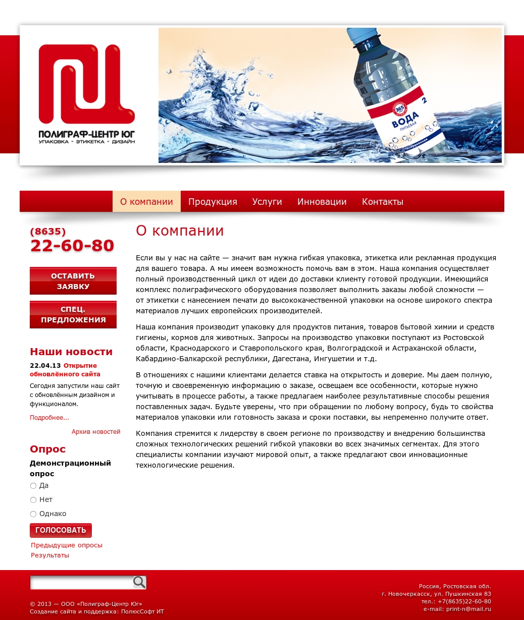 Корпоративный сайт со слайдером изображений, опросами, возможностью оставить предварительную заявку на создание упаковки и так же возможностью пообщаться с менеджерами компании не покидая сайта. Совместно с дизайнерами компании был разработан дизайн веб-сайта.