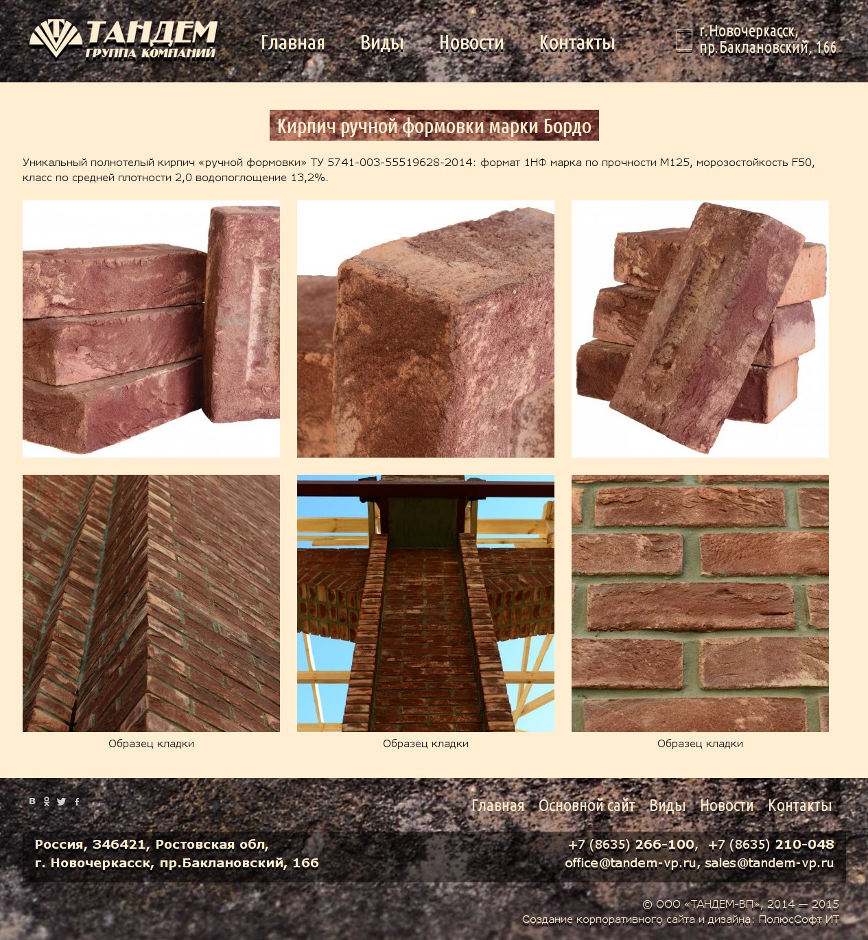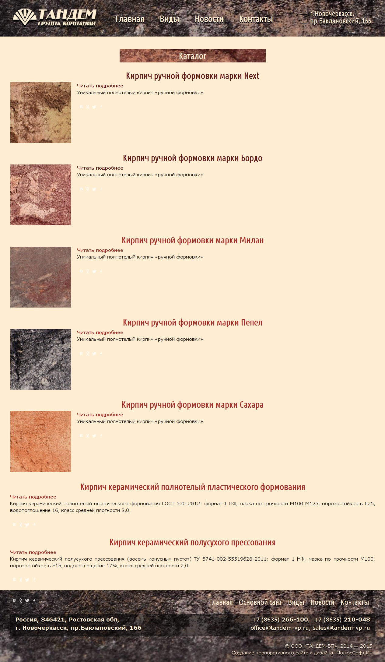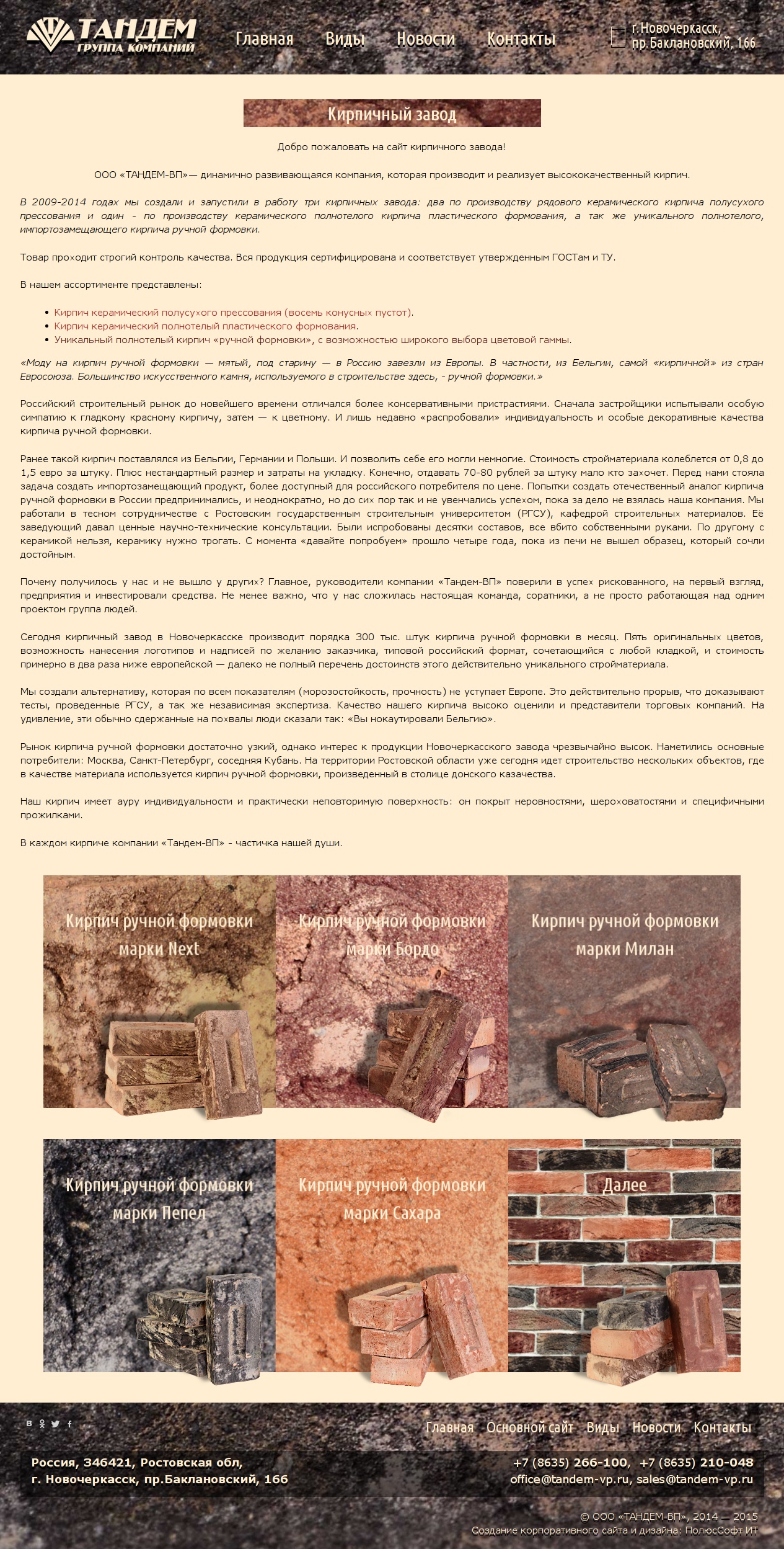 Выполнили создание корпоративного сайта с каталогом продукции для ООО «ТАНДЕМ-ВП», его подраздления по производству кирпича ручной формовки. Разработали дизайн сайта, после чего сверстали дизайн, добавив анимации, различные эффекты, включая и 3D вращение, выполнив в том числе адаптивную вёрстку для мобильных платформ. Так же разработали тексты для сайта.