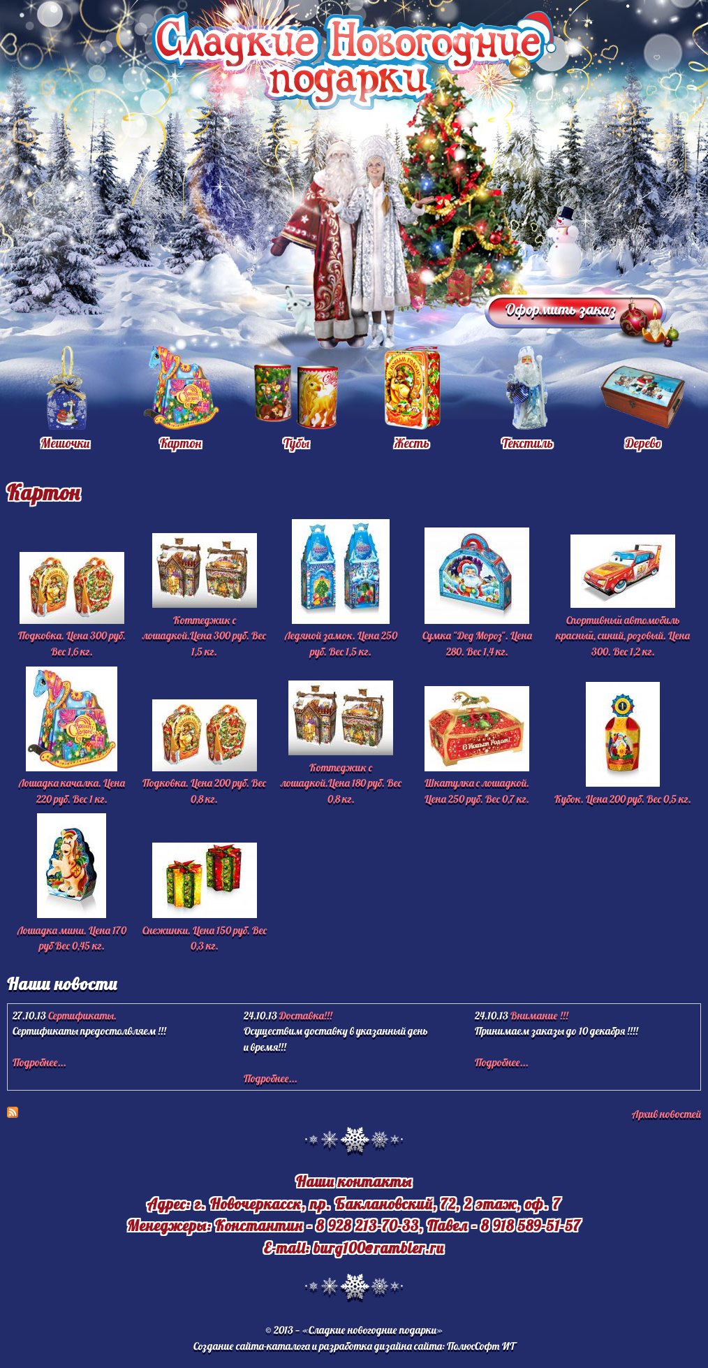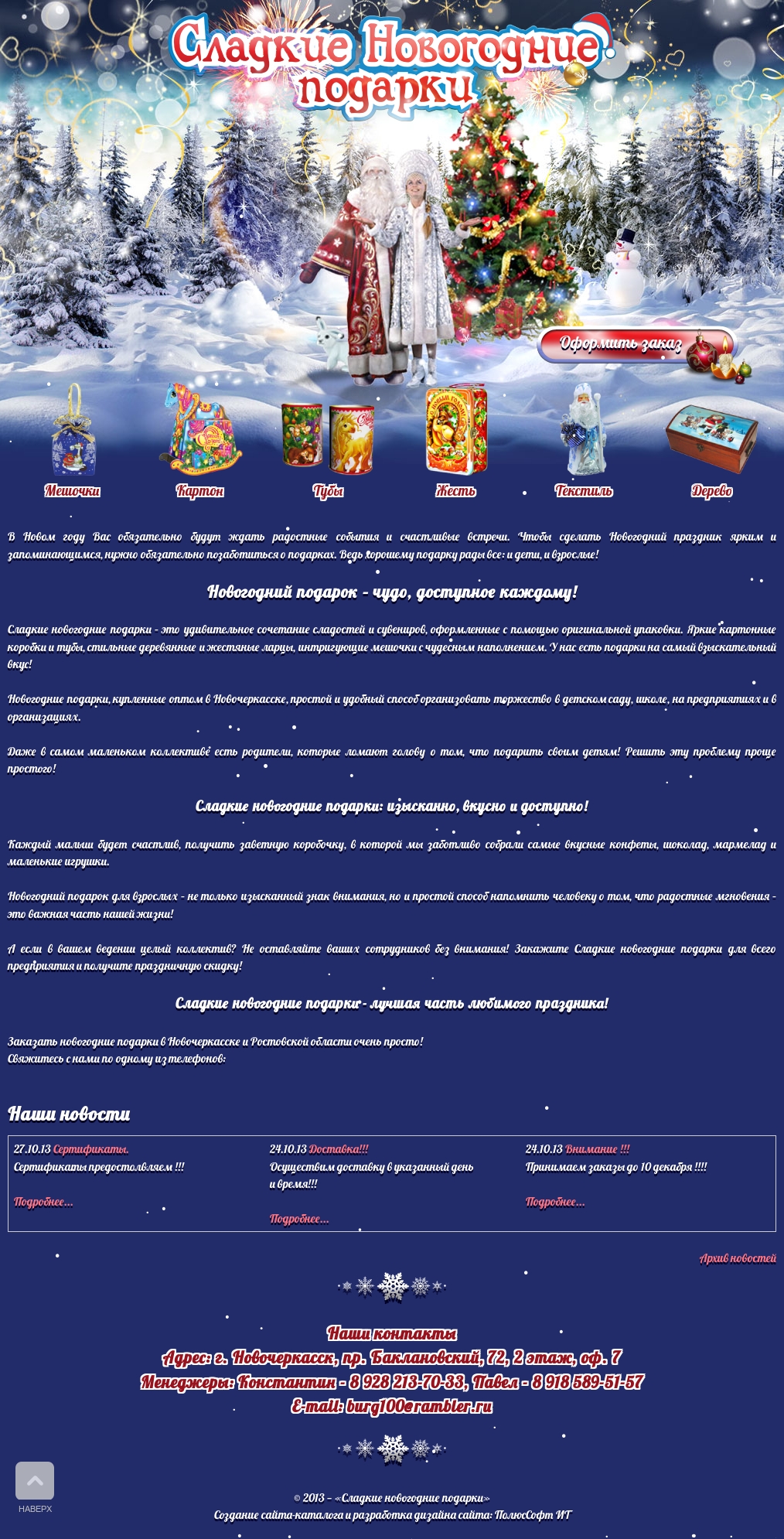 Сайт-минимагазин для компании реализующей новогодние подарки в оригинальных упаковках. Разработан дизайн сайта, написаны тексты для главной страницы, применены небольшие эффекты анимации, в том числе в виде "снега".